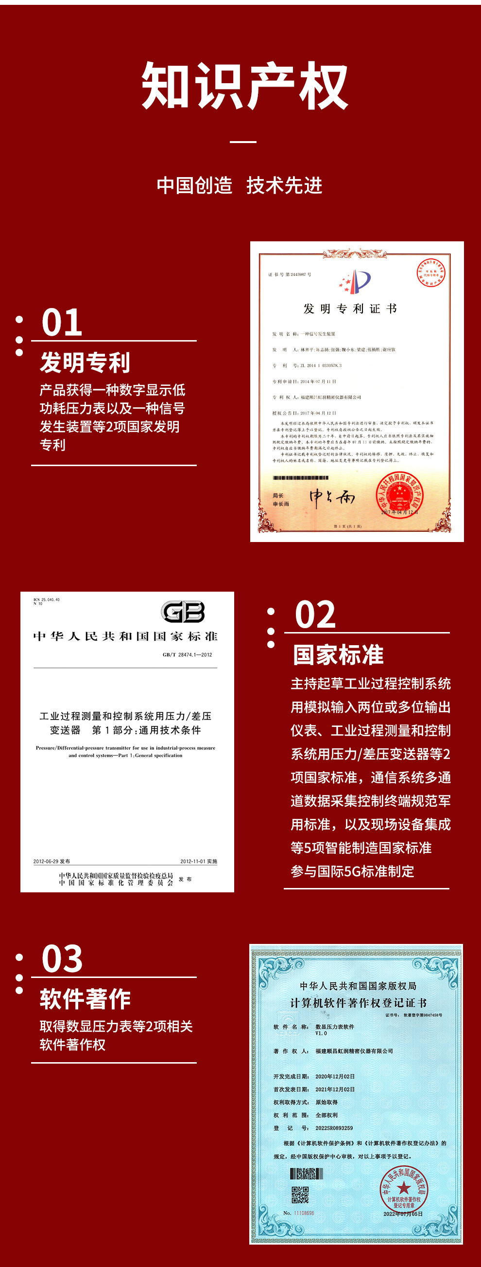 虹潤(rùn)公司是專業(yè)生產(chǎn)數(shù)顯壓力表的國(guó)家專精特新“小巨人”企業(yè)。生產(chǎn)的智能數(shù)字壓力表,具有氣體液體通用,測(cè)量精度高,自動(dòng)溫度補(bǔ)償,響應(yīng)速度快,電池供電低功耗漂移小等特點(diǎn)。產(chǎn)品獲得一種數(shù)字顯示低功耗壓力表以及一種信號(hào)發(fā)生裝置等2項(xiàng)國(guó)家發(fā)明專利,主持起草工業(yè)過(guò)程控制系統(tǒng)用模擬輸入兩位或多位輸出儀表、工業(yè)過(guò)程測(cè)量和控制系統(tǒng)用壓力/差壓變送器等2項(xiàng)國(guó)家標(biāo)準(zhǔn),通信系統(tǒng)多通道數(shù)據(jù)采集控制終端規(guī)范軍用標(biāo)準(zhǔn),以及現(xiàn)場(chǎng)設(shè)備集成等5項(xiàng)智能制造國(guó)家標(biāo)準(zhǔn),參與國(guó)際5G標(biāo)準(zhǔn)制定,取得數(shù)顯壓力表等2項(xiàng)相關(guān)軟件著作權(quán)。產(chǎn)品廣泛石化、冶金、電力、制藥、食品、航空航天、工業(yè)循環(huán)水系統(tǒng)等諸多領(lǐng)域。