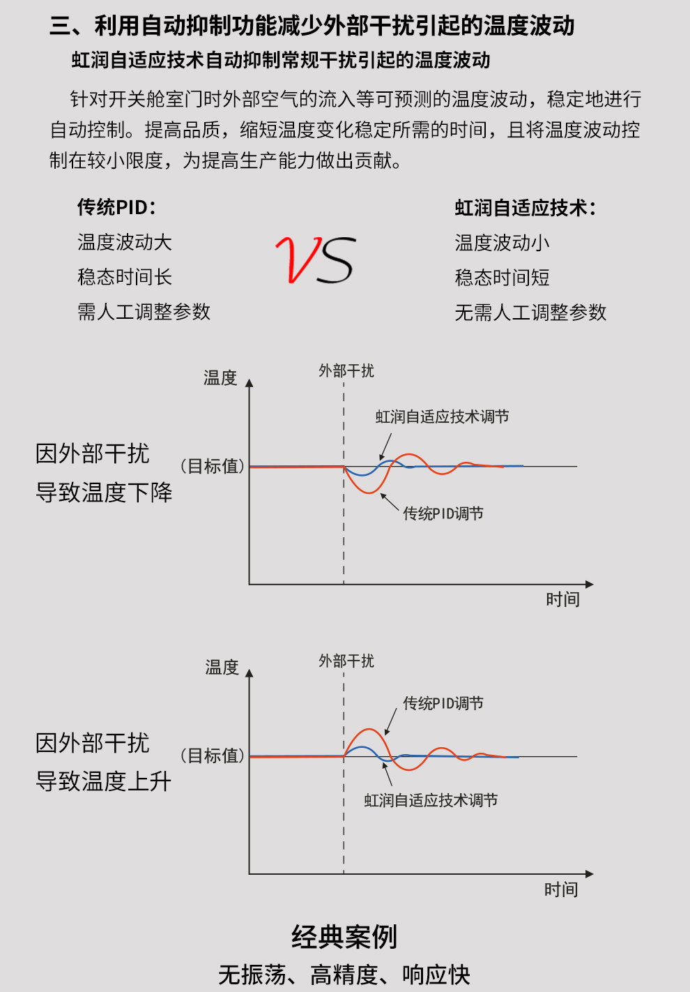 虹潤公司是專業(yè)生產(chǎn)溫控器的國家專精特新“小巨人”企業(yè)。生產(chǎn)的傻瓜式智能溫控器,具有傻瓜式操作,真正人工智能算式,無需人工整定參數(shù),控制精度可達(dá)±0.1°C,高抗干擾等特點(diǎn)。產(chǎn)品獲得模糊PID控制儀及控制方法、人工智能調(diào)節(jié)器、智能化控制器、移相觸發(fā)控制器、閥門自動(dòng)手動(dòng)無擾動(dòng)操作控制方法及裝置等5項(xiàng)國家發(fā)明專利,主持起草工業(yè)過程控制系統(tǒng)用模擬輸入兩位或多位輸出儀表、物聯(lián)網(wǎng)智能溫度儀表通用技術(shù)條件、工業(yè)過程測量和控制系統(tǒng)用智能調(diào)節(jié)器等3項(xiàng)國家標(biāo)準(zhǔn),以及通信系統(tǒng)多通道數(shù)據(jù)采集控制終端規(guī)范軍用標(biāo)準(zhǔn),參與國際5G標(biāo)準(zhǔn)制定,取得傻瓜式模糊PID調(diào)節(jié)儀等3項(xiàng)相關(guān)軟件著作權(quán)。產(chǎn)品廣泛應(yīng)用于電力、石化,冶金、制藥、食品等幾乎所有工業(yè)現(xiàn)場,實(shí)現(xiàn)精準(zhǔn)控溫,保障生產(chǎn)安全與質(zhì)量。