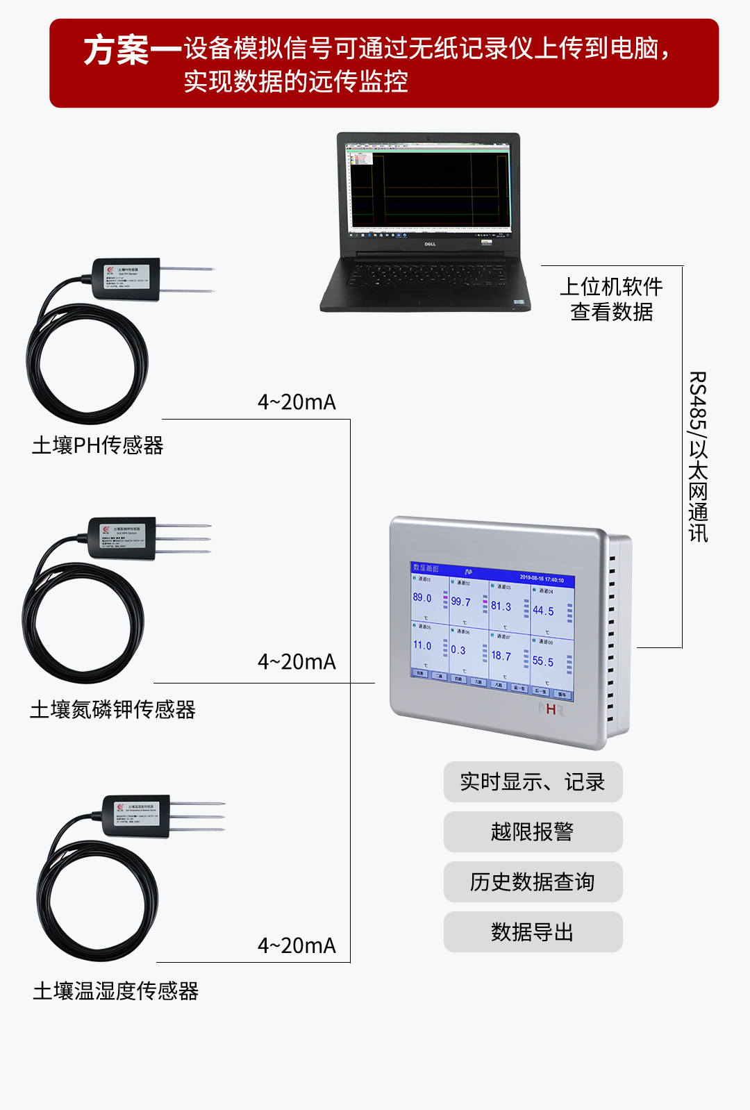 虹潤公司是專業(yè)生產(chǎn)環(huán)境監(jiān)測(cè)儀表的國家專精特新“小巨人”企業(yè)。生產(chǎn)的直插式土壤傳感器涵蓋土壤溫濕度、土壤氮磷鉀、土壤PH三款傳感器,具有測(cè)量范圍寬,精度高,響應(yīng)快,IP68防護(hù)等級(jí),模擬量變送輸出或RS485通訊等特點(diǎn)。產(chǎn)品獲得一種適應(yīng)性強(qiáng)的PH控制儀、一種信號(hào)發(fā)生裝置等2項(xiàng)國家發(fā)明專利,主持起草現(xiàn)場設(shè)備集成等5項(xiàng)智能制造國家標(biāo)準(zhǔn),以及現(xiàn)場設(shè)備工具(FDT)接口規(guī)范、物聯(lián)網(wǎng)總體技術(shù)智能傳感器特性與分類、過程分析技術(shù)系統(tǒng)等3項(xiàng)國家標(biāo)準(zhǔn),參與國際5G標(biāo)準(zhǔn)制定,取得土壤溫濕度、土壤pH、土壤氮磷鉀等3項(xiàng)相關(guān)軟件著作權(quán)。產(chǎn)品廣泛應(yīng)用于溫室大棚、花卉養(yǎng)殖、草地牧場、精細(xì)農(nóng)業(yè)等場合對(duì)土壤參數(shù)的檢測(cè)。