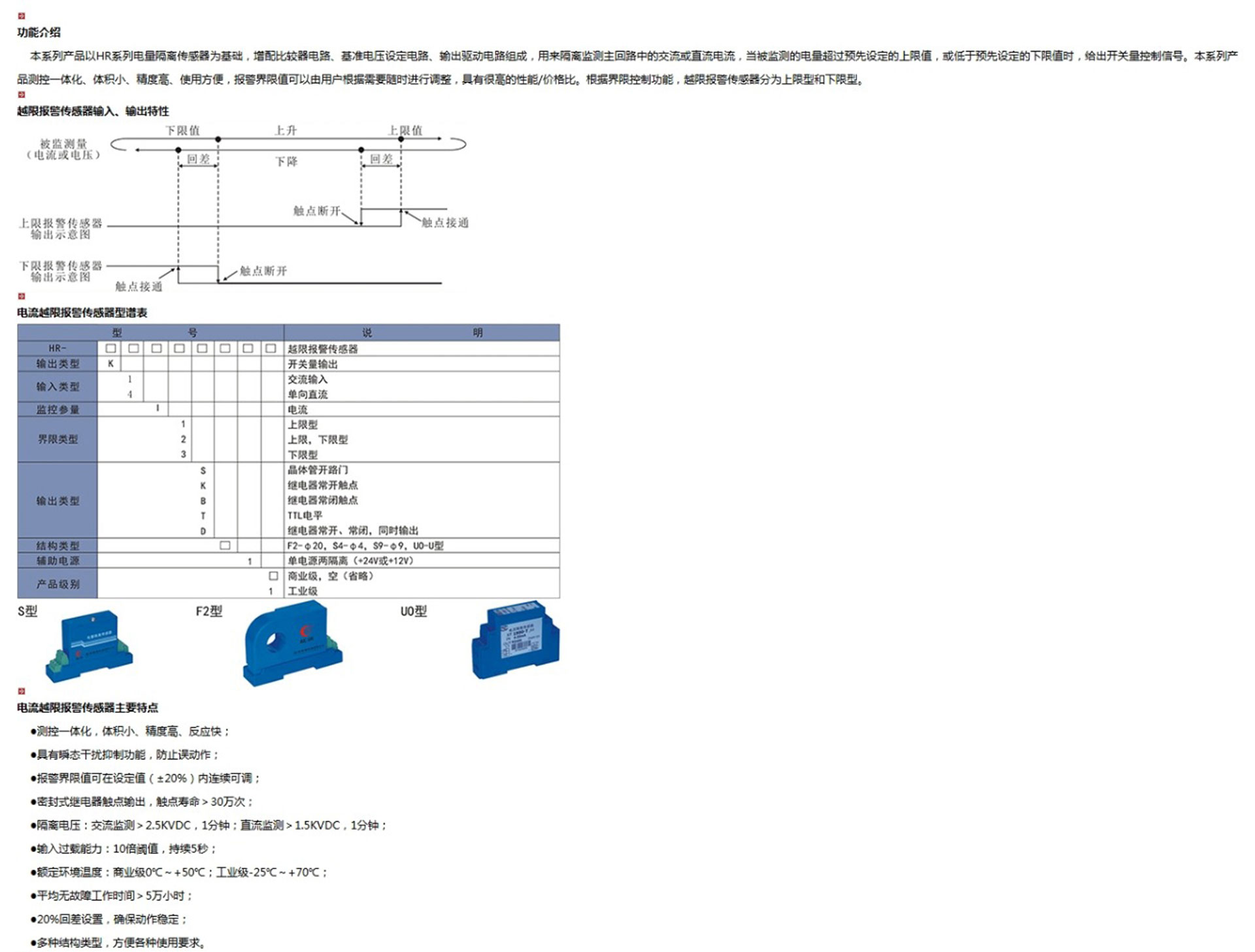電流越限報警傳感器以HR系列電量隔離傳感器為基礎(chǔ),增配比較器電路、基準電壓設(shè)定電路、輸出驅(qū)動電路組成,用來隔離監(jiān)測主回路中的交流或直流電流,當被監(jiān)測的電量超過預先設(shè)定的上限值,或低于預先設(shè)定的下限值時,給出開關(guān)量控制信號。
