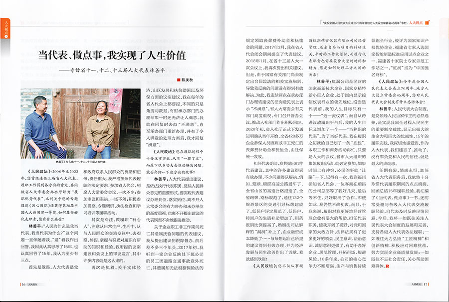林善平:虹潤(rùn)公司是民營(yíng)的國(guó)家高新技術(shù)企業(yè)、國(guó)家專精特新小巨人企業(yè),處于國(guó)內(nèi)顯示控制儀表行業(yè)的領(lǐng)先地位。沒(méi)當(dāng)選代表前,我的人生目標(biāo)只有一個(gè)——“造一流儀表”,而自從跨進(jìn)議政履職平臺(tái)后,我的人生目標(biāo)又增加了一個(gè)——“當(dāng)稱職的代表”。為了當(dāng)好代表,我在履職之初就給自己劃了一條“底線”:本職工作和商務(wù)活動(dòng)再忙,只要是人大的會(huì)議、省市人大組織的集體履職活動(dòng),就必定參加。如果時(shí)間上有沖突,公司的事就“讓路”一下。記得有一次,我到福州參加省人代會(huì),一位客商在順昌的公司總部等了我好幾天,最后等不住,只好取消了合作。即便如此,我仍然不改初衷。而且,于我來(lái)說(shuō),履職對(duì)我更好地經(jīng)營(yíng)管理企業(yè)有很大的幫助。擔(dān)任代表職務(wù),使我開(kāi)闊了視野,對(duì)黨和國(guó)家的大政方針政策、法律法規(guī)有了更多更好的領(lǐng)會(huì),民主意識(shí)、法治意識(shí)、誠(chéng)信意識(shí)更強(qiáng)了,有助于辦好企業(yè)、規(guī)范管理、開(kāi)拓市場(chǎng)、規(guī)避風(fēng)險(xiǎn)。10多年來(lái),公司的核心競(jìng)爭(zhēng)力不斷增強(qiáng),生產(chǎn)與銷售持續(xù)領(lǐng)跑全行業(yè),被評(píng)為國(guó)家知識(shí)產(chǎn)權(quán)優(yōu)勢(shì)企業(yè)、福建省七家入選國(guó)家智能制造標(biāo)準(zhǔn)應(yīng)用試點(diǎn)企業(yè)之一、福建省十家院士專家示范工作站之一,“虹潤(rùn)”成為“中國(guó)馳名商標(biāo)”。