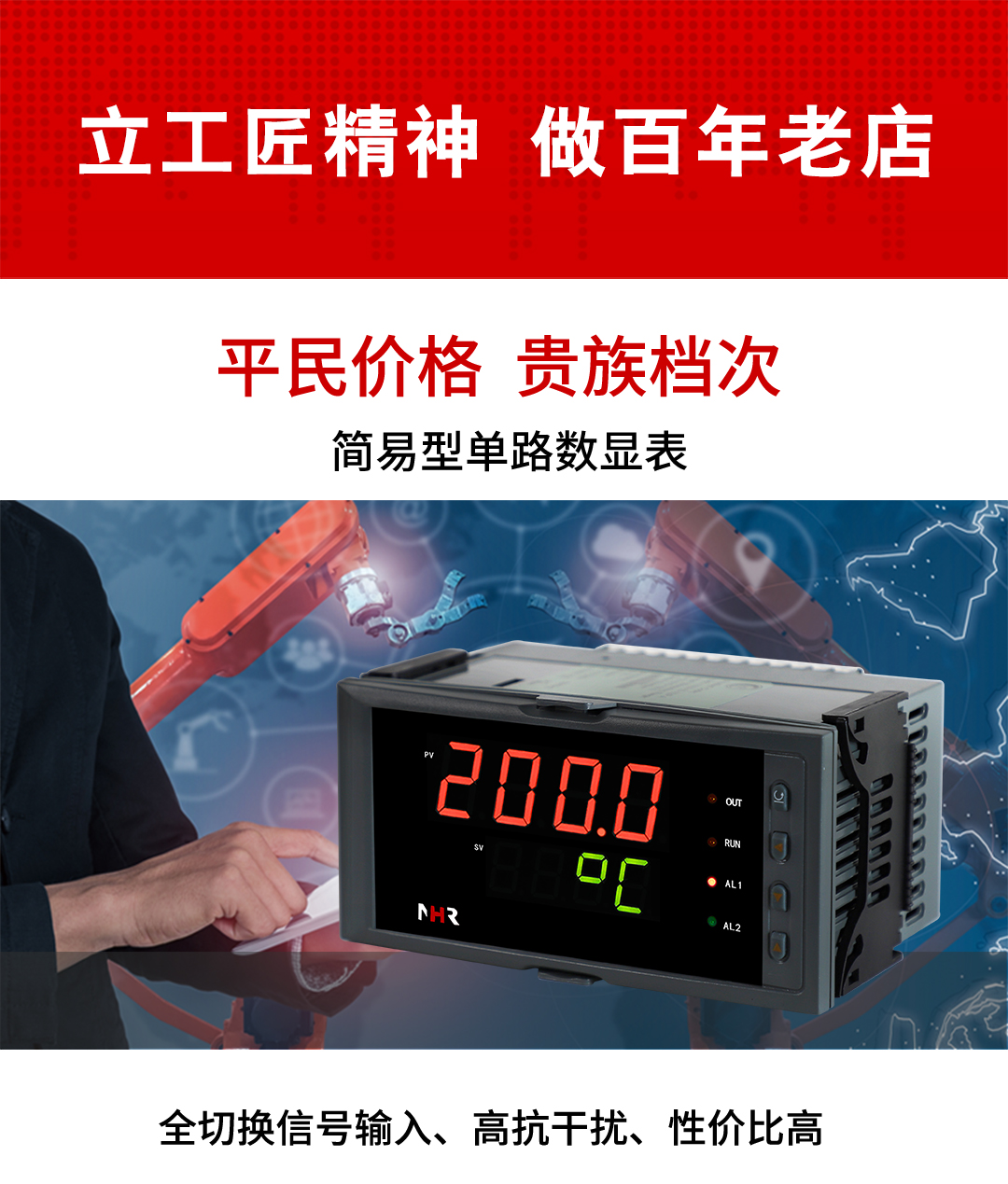 虹潤公司是專業(yè)生產(chǎn)數(shù)顯表的國家專精特新“小巨人”企業(yè),生產(chǎn)的簡易型數(shù)字顯示控制儀,具有全切換信號輸入,多種外形尺寸,高抗干擾,輸入/輸出/電源三隔離,性價比高等特點。該產(chǎn)品不僅通過德國萊茵 CE 認證,還獲得巡回檢測顯示方法及裝置、儀表殼體等2項國家發(fā)明專利,主持起草工業(yè)過程控制系統(tǒng)用模擬輸入兩位或多位輸出儀表、物聯(lián)網(wǎng)智能溫度儀表通用技術(shù)條件等2項國家標準,以及通信系統(tǒng)多通道數(shù)據(jù)采集控制終端規(guī)范軍用標準,參與國際5G標準制定,取得簡易數(shù)顯儀表等3項相關(guān)軟件著作權(quán)。產(chǎn)品廣泛應用于電力、石化、冶金、化工、造紙、食品、輕工、制藥、熱處理、水處理、機械配套等各種工業(yè)現(xiàn)場。