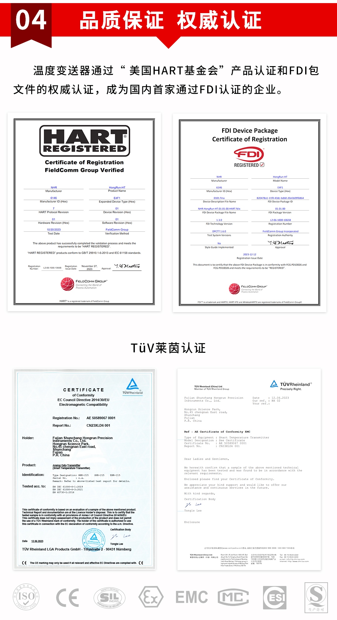 虹潤(rùn)公司是專(zhuān)業(yè)生產(chǎn)溫度變送器的國(guó)家專(zhuān)精特新“小巨人”企業(yè)。生產(chǎn)的智能溫度變送器,具有適配各類(lèi)溫度傳感器,精度高,通過(guò)編程線修改輸入信號(hào)類(lèi)型及量程,高抗干擾,HART或485通訊等特點(diǎn)。該產(chǎn)品不僅通過(guò)HART基金會(huì)認(rèn)證、德國(guó)萊茵 CE 認(rèn)證與 SIL 功能安全認(rèn)證,還獲得具備減震抗干擾能力的溫度變送器、信號(hào)隔離器、一種二端子模塊、無(wú)源信號(hào)隔離器等4項(xiàng)國(guó)家發(fā)明專(zhuān)利,主持起草物聯(lián)網(wǎng)智能溫度儀表、現(xiàn)場(chǎng)設(shè)備工具(FDT)接口規(guī)范、工業(yè)過(guò)程測(cè)量和控制系統(tǒng)用溫度變送器等3項(xiàng)國(guó)家標(biāo)準(zhǔn),以及通信系統(tǒng)多通道數(shù)據(jù)采集控制終端規(guī)范軍用標(biāo)準(zhǔn),參與國(guó)際5G標(biāo)準(zhǔn)制定,取得HART溫度變送器、智能溫度變送器等3項(xiàng)相關(guān)軟件著作權(quán)。產(chǎn)品廣泛應(yīng)用于石油、化工、電力、冶金、制藥、食品、水處理等各種工業(yè)領(lǐng)域。